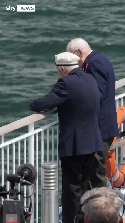 (L-R)) D-Day veterans John Life and Donald Jones return to Sword Beach in Normandy, France, where they landed 80 years ago. Pic: PA