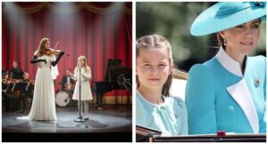Beside her stood Princess Charlotte, barely nine years old, dressed simply in white lace. Her small fingers clutched the microphone as if it were the only thing anchoring her to the moment. She looked up once — to her father, standing quietly near the doorway — and then back to her mother. Catherine gave a nod, the kind that says I’m here. You can do this.